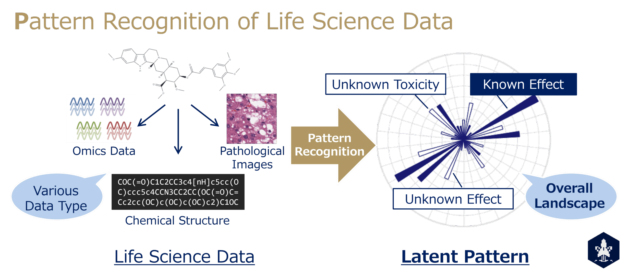 私たちは, 生命科学における複雑なデータ──オミクス, 画像, 構造, 文献など──の背後に潜むパターンや構造を数理的に捉えることで, 生命現象の理解のあり方を拡張することを目指しています。 医薬品を軸としつつ, 深層学習や統計的手法を用いて, 恣意性を抑えた表現の獲得と可視化を行い, 観測値に埋もれた本質的な構造を引き出す研究に取り組んでいます。